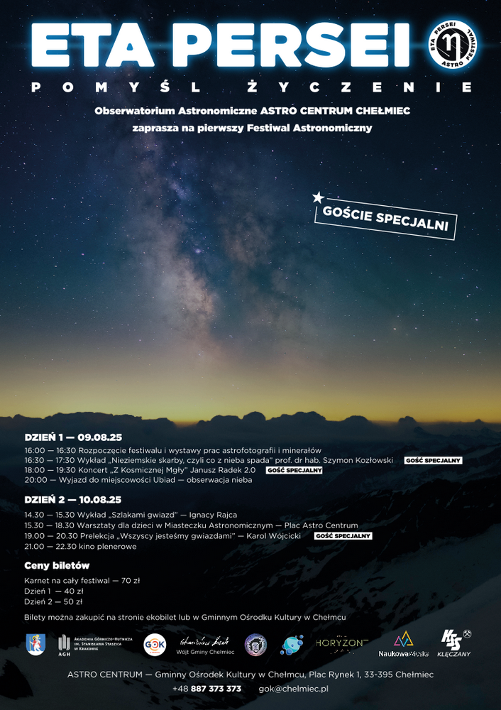 Wraz z Wójtem Gminy Chełmiec - Panem Stanisławem Kuzakiem - zapraszamy Państwa na dwudniową podróż w głąb kosmosu, pełną inspirujących spotkań, niezwykłych wykładów, koncertów i obserwacji nieba! Przygotujcie się na festiwal, który łączy naukę, muzykę i magię Wszechświata!
